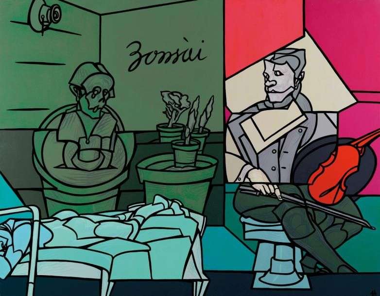 The Bonzaï school Acrylique sur toile. Titrée en haut au centre, monogrammée en bas à droite, signée et titrée au dos. 114 x 146 cm