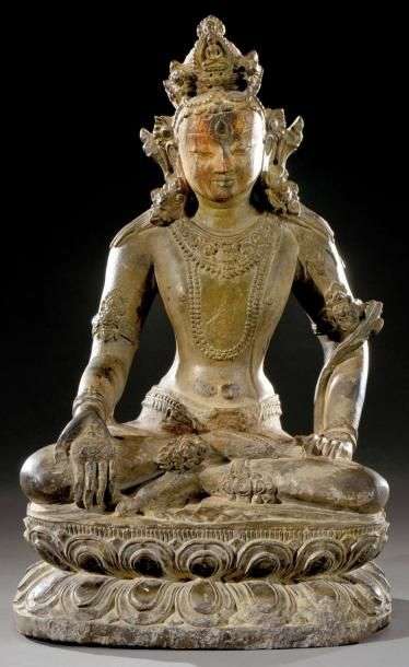 Rare sculpture en pierre représentant la divinité Avalokiteshvara assise en position lotiforme. H: 42,5 cm L: 26 cm (petits manques) Un certificat d'authenticité délivré par la Galerie Ottini à Turin sera remis à l'acquéreur