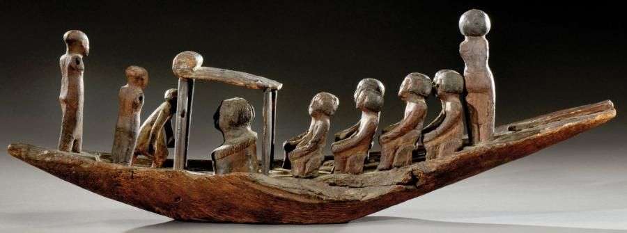 Première période intermédiaire (2200 - 2033 avant J.-C. ou Moyen Empire, 2065-1781 av. J.-C.) Barque funéraire présentant huit rameurs assis, portant une perruque courte, et un barreur debout vêtu d'un long pagne. Ils sont placés devant un dais sous lequel est représenté le défunt. Deux prêtres, le crâne rasé, sont placés à l'avant de la barque, et un personnage vêtu d'un long pagne se courbe devant le défunt. Bois (cèdre ?), restes de polychromie noire et rouge. Mât, barre, rame, proue et les bras de certains personnages manquants, petits accidents, sinon bel état de conservation. H.: 29,5 cm| L.: 67 cm| Pr.: 15,5 cm. Un exemplaire similaire au Musée du Louvre (N° inv. E284, cote cliché Rmn: 95-012200). Expert: Daniel LEBEURRIER tel: 01 42 61 37 66