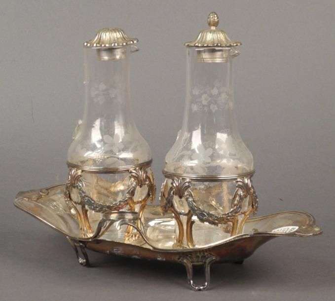 Huilier-vinaigrier Support en argent massif armorié à décor de guirlandes