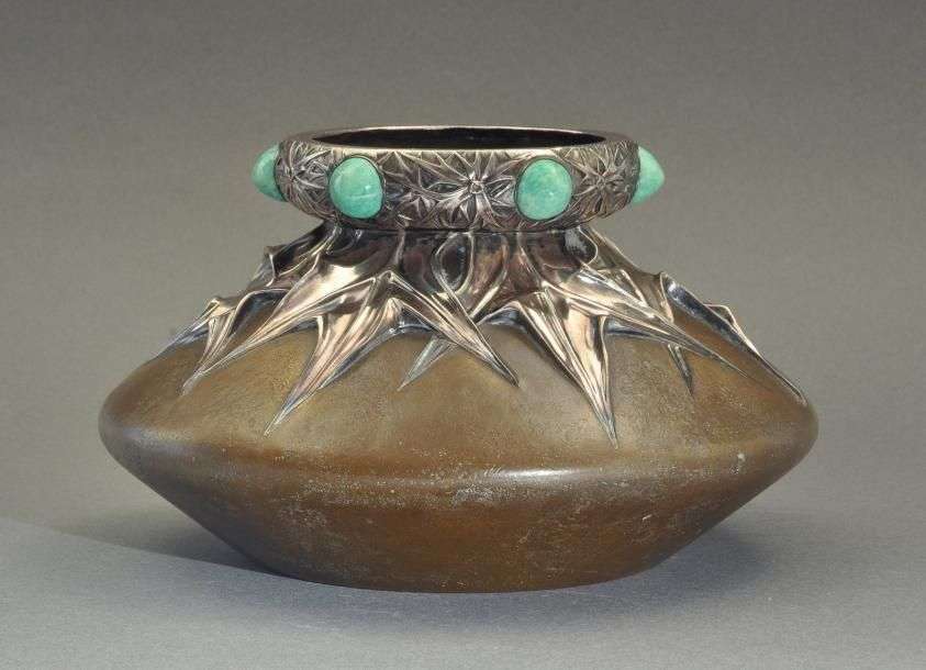 Exceptionnel vase à panse renflée et col étranglé à bordure arrondie en bronze à patine brune et argent, présentant un décor en relief de feuilles et de cabochons en pierre verte. Signé sur le bord supérieur du col «L.Gaillard». Vers 1900-1910. H: 14 cm Diam: 22 cm An exceptional brown and silver bronze vase with a raised decoration of leaves and with green stone cabochons. Signed on the upper rim of the neck «L.Gaillard». Circa 1900-1910. H: 5 ½ in Diam: 8 ¾ in Au même titre que Lalique, Vever ou Fouquet, Lucien Gaillard est l'un des plus grands créateurs de son temps à la production plus restreinte mais tout aussi empreinte d'originalité. Tel un orfèvre, ses objets à la ciselure fine lui vaudront une reconnaissance et les honneurs des contemporains. Il est l'héritier d'une longue lignée de créateurs et n'a de cesse que d'innover et d'affiner ses recherches et sa technique. Cette perpétuelle quête de perfection, se retrouve dans l'ensemble de son oeuvre qui dénote par une qualité d'exécution remarquable aux patines fines et très abouties. Gaillard ne s'encombre d'aucun détail, il va à l'essentiel en sublimant les matières et leur naturalisme qui sont mises en valeur de part la qualité de la sculpture, de la ciselure et le travail réalisé sur les patines. Parmi les objets précieux conçus par Gaillard avec un goût et une imagination raffinés, il convient de citer des peignes, des bijoux, des parures, des flacons de parfum, des affiches ou encore des vases comme celui que l'on vous présente. Dans celui-ci, comme dans la plupart de ses oeuvres, on retrouve une constante de son art, l'appropriation et l'influence de l'art japonais qui se reflète dans les formes utilisées, le thème abordé ou encore la coloration des matières choisie. Even though his production was more limited, Lucien Gaillard, is, in the same way as Lalique, Vever or Fouquet, one of the greatest and most original designer of his time. His finely chiselled objects brought him recognition amongst his cont