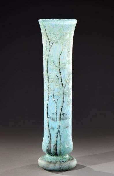 Rare et important vase à corps cylindrique évasé en partie haute sur talon circulaire renflé en verre doublé à décor dégagé à l'acide et émaillé brun, blanc et vert d'un paysage forestier et de cygnes. Signé «Daum Nancy». Vers 1900. H: 57 cm A rare lined glass vase acid-etched with a forest landscape and swans. Signed «Daum Nancy». Circa 1900. H: 22 ½ in Bibliographie: - Claude Pétry, «Daum dans les musées de Nancy», décor similaire reproduit à la page 39 référence 27. - Clothilde Bacri, «Daum», Michel Aveline Editeur, 1992, modèle similaire reproduit à la page 48