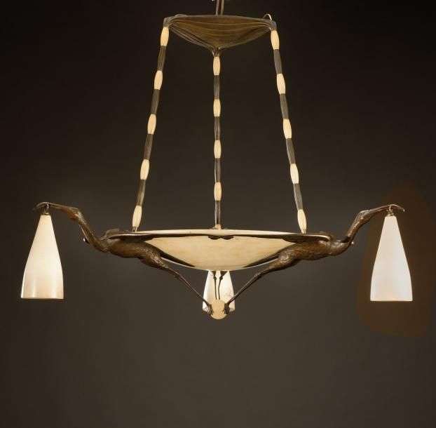 Rare lustre modèle «trois cigognes» à armature en bronze à patine vert antique enserrant au centre une large vasque circulaire bombée en albâtre et présentant trois bras de lumière figurant trois cigognes, leurs pattes réunies sous la vasque par une boule en albâtre, chacune tenant dans son bec une tulipe en albâtre formant cache ampoule. L'ensemble est maintenu par un cachebélière à corps conique d'ou s'élancent trois chaînes de suspension composées d'une alternance d'olivettes en albâtre et de maillons en bronze. Signé «Albert Cheuret». Vers 1925. H: 76 cm Diam: 87 cm «Trois cigognes», a rare bronze centre light with three branches of lights held by chains in alabaster bronze. Signed «Albert Cheuret». Circa 1925. H: 30 in Diam: 34 ¼ in Bibliographie: Centre Pompidou, exposition «Lumières je pense à vous», Paris, 1985, modèle référencé et reproduit sous le n° 22, p. 124