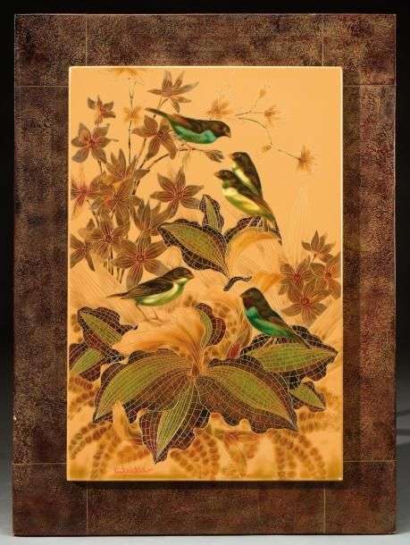 Panneau décoratif rectangulaire en laque gravée présentant un décor polychrome de fleurs et d'hirondelles de Chine sur fond ivoire. Encadrement d'origine en laque arrachée marron. Signé à la laque rouge en bas à gauche «G. Suisse». Vers 1950. Dimensions (hors cadre): 44,5 x 67 cm Dimensions (avec cadre): 63 x 85 cm (éclats en bordure) A decorative engraved lacquered panel decorated with flowers and swallows and in its original torn lacquer frame. Signed in red lacquer on the lower left «G. Suisse». Circa 1950. Dimensions (without frame): 17 ½ x 26 ½ in Dimensions (with frame): 24 ¾ x 33 ½ in