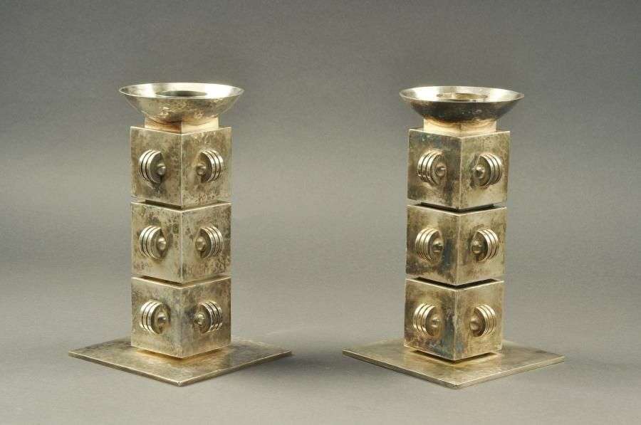 Rare paire de bougeoirs modernistes en métal argenté à surface martelée présentant un fût composé de trois cubes superposés, agrémentés d'un décor en relief de trois demi-disques adossés flanqués de demi-sphères. Ils présentent une coupelle évasée formant bras de lumière et reposent sur une base carrée débordante. Signés «J.Després» et poinçon de l'orfèvre. Vers 1930. H: 26,5 cm l: 15,5 cm P: 15,5 cm A pair of rare, hammered silver plated, modernistic candle holders composed of three superimposed cubes decorated with three half disks flanked by half spheres. It has a small bowl forming one light and standing on a jutting base. Signed «J.Després» and silversmith's hallmark. Circa 1930.Jean Després (1889-1980) est l'un des artistes les plus novateurs des années 1920 et 1930 dans les domaines du bijou et de l'orfèvrerie. Il est considéré comme l'un des maîtres d'oeuvre indiscutés du mouvement de renouveau de l'orfèvrerie de table et de l'orfèvrerie religieuse. L'ensemble exceptionnel des pièces que nous vous présentons est caractéristique de sa rare période moderniste et reflète toutes les spécificités relatives à ce style. Les pièces de forme qu'il monte lui-même au marteau, se caractérisent par leurs formes simples, leurs volumes harmonieux et leur ornementation sobre. Les lignes comme les formes de ses objets sont toujours épurées mais leur surface généralement lisse dans les années 1920 deviendra martelée dans les décennies suivantes comme pour les objets présentés. Les traits ornementaux que nous retrouvons dans les années 1930 sont des motifs à godrons, verticaux ou horizontaux parfois saillants, de grandes sphères ou des demi-sphères. Ils séduisent par leur caractère artisanal et leur style à la fois sobre et rustique. Desprès recherche constamment l'alliance d'une parfaite et précise exécution dans la réalisation de l'objet et son usage pratique. L'artiste affirmera qu'il déteste l'Art «non fonctionnel» et le critique Maximilien Gauthier confirmera que l'oeuvre