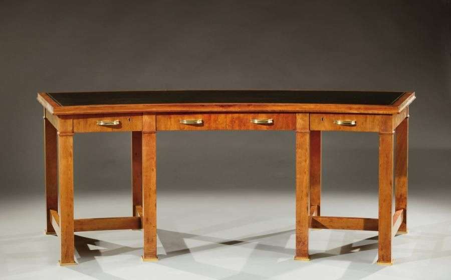 Important bureau de ministre en acajou moucheté présentant un plateau à découpe arrondie gainé de cuir noir souligné d'un filet doré, ouvrant en ceinture par quatre tiroirs à poignées en laiton doré. Il repose sur huit pieds quadrangulaires reliés par des entretoises en «H» et terminés par des patins plats débordants. Vers 1940-1950. H: 75,5 cm L: 200 cm P: 80 cm (manque clef, baguette à recoller et légères rayures d'usage) A flecked mahogany pedestal desk with a black leather top and opening by four drawers with gilded brass handles. Circa 1940-1950. H: 29 ¾ in L: 78 ¾ in D: 31 ½ in Bibliographie: - «Mobilier et Décoration», 28ème année, n°12, 1948, modèle reproduit page 22. - Alain-René Hardy et Gaelle Millet, «Jacques Adnet», Les Editions de l'Amateur, Paris, 2009, variante au modèle reproduite à la page 123