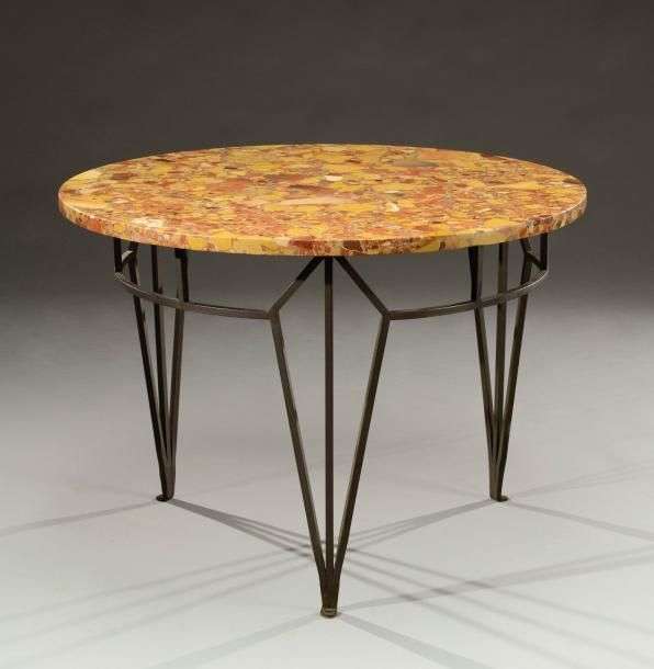 Table basse à plateau circulaire en marbre brèche d'Alep dans les tons bruns et ocre reposant sur un piétement tripode architecturé en métal laqué noir. Vers 1950. H: 50 cm Diam: 70,5 cm (légères rayures d'usage) A coffee table with a circular Alep marble top on a lacquered metal tripod base. Circa 1950. H: 19 ¾ in Diam: 27 ¾ in Bibliographie: Yves Badetz, «Marc Du Plantier», Norma Editions, Paris, 2010, structure de la table similaire au modèle reproduite à la page 129. Un certificat d'authenticité de Félix Marcilhac daté du 30 mai 2001 sera remis à l'acquéreur sur demande. A certificate of authenticity from Félix Marcilhac, dated May 30th 2001 will be given to the buyer when requested