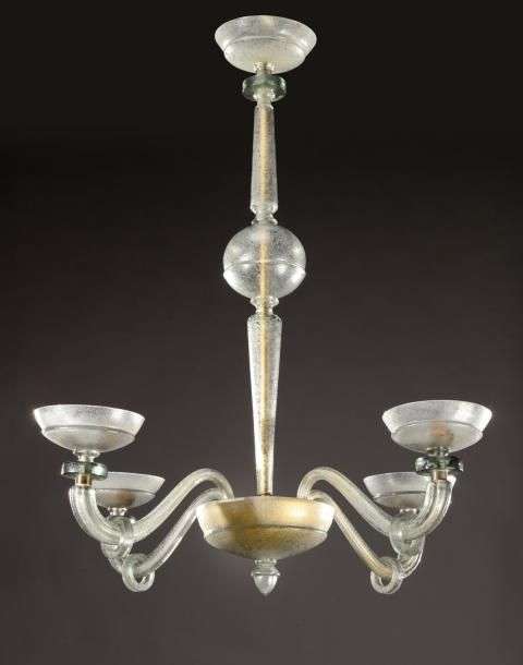 Exceptionnel et important lustre en verre «corroso» soufflé bleu lagune présentant un fût composé de plusieurs éléments géométriques superposés enserrant quatre bras de lumière en volutes surmontés de larges coupelles et soulignés de disques suspendus. Vers 1950. H: 125 cm Diam: 110 cm An exceptional centre light in blown «corroso» glass composed of several geometrical elements superimposed by four branches of lights. Circa 1950. H: 49 ¼ in Diam: 43 ¼ in Souvent réalisé sur commande spéciale notamment pour les intérieurs d'André Arbus, ce type de modèle de luminaires réalisés par Seguso Vetri D'Arte et distribué par la Maison Veronèse à Paris, sont extrêmement rare sur le marché. This very rare type of lighting was often made on special order by Seguso Vetri D'Arte for André Arbus's interiors and distributed by the Maison Veronèse in Paris