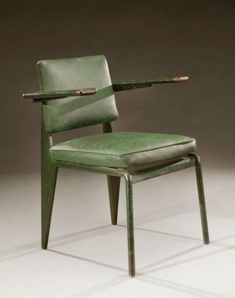 Rare fauteuil en métal laqué vert à assise carrée, dossier bandeau droit et accotoirs à manchettes plates, reposant à l'avant sur deux pieds en métal tubulaire courbé et soudé et sur deux montants profilés à l'arrière. Garniture de l'assise et du dossier recouverte d'une moleskine verte. Etiquette d'origine sous une traverse marquée «EDF CD 31». Vers 1935. H: 78 cm l: 64 cm P: 50 cm A rare green lacquered metal armchair with tubular metal front legs and streamlined uprights at the back. The seat and backrest are covered in green leatherette. The original label is under the crosspiece marked «EDF CD 31». Circa 1935. H: 30 ¾ in W: 25 ¼ in D: 19 ¾ in Bibliographie: - «Jean Prouvé», Editions Taschen, Köln, 1991, modèle similaire reproduit à la page 50. - Peter Sulzer, «Jean Prouvé oeuvre complète Volume 2: 1934-1944», Editions Birkhäuser, Basel, 2005, modèle similaire reproduit aux pages 76 et 77. En 1934, le chiffre d'affaire de la société «Les Ateliers Jean Prouvé S.A» est en diminution sensible. Les grosses affaires de la Cité de la Muette à Drancy, l'hôtel de ville de Boulogne-Billancourt ainsi que l'étude suivie de la réalisation de bureaux et de fauteuils pour la Compagnie parisienne de distribution d'électricité permettront d'améliorer le rendement de la société. Le fauteuil de bureau à accotoirs a été réalisé pour la Compagnie parisienne de distribution d'électricité SA d'après le plan intitulé «120 fauteuils C.P.D.E» et dessiné par Robert Feck le 12 février 1935. Les pieds arrière en tôle pliée sont profilés, les pieds avant sont tubulaires. Le support des accoudoirs est en tube écrasé et la garniture est en cuir. Un second plan sera proposé en mars 1935 par Jean-Marie Glatigny qui illustrera ce fauteuil avec siège et dossier en cuir. Jean Prouvé expliquera en 1981 que ce fauteuil a la qualité d'être extrêmement confortable, qualité qui sera reprise par le grand fabricant américain Knoll. In 1934 the «Les Ateliers Jean Prouvé S.A» company's turnover was decreas
