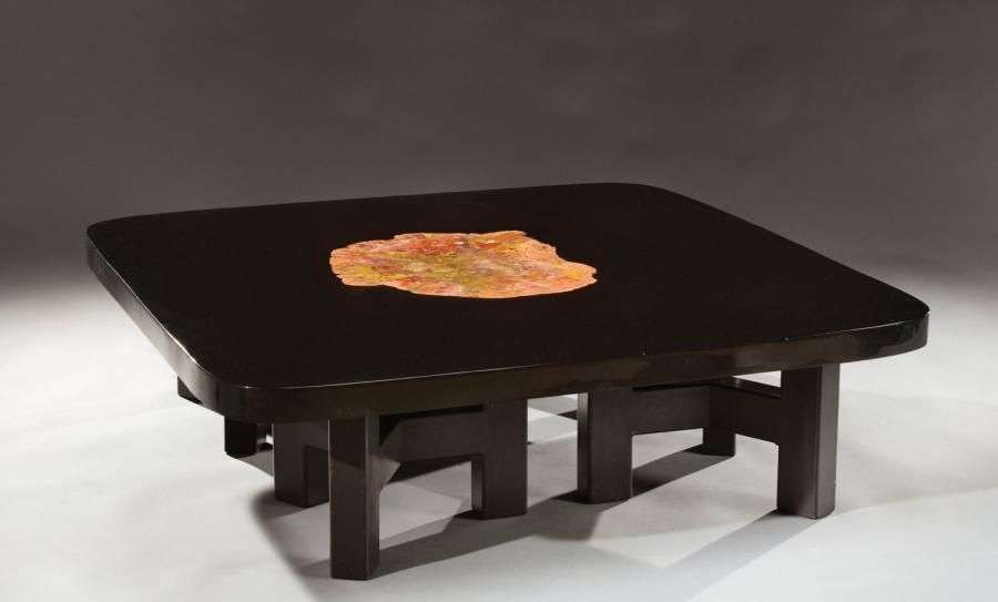 Exceptionnelle et importante table basse à plateau carré à bords arrondis en résine laquée noire enserrant au centre un élément incrusté en bois fossilisé d'Arizona dans les tons rouges orangés. Il repose sur quatre piétements tripodes bas quadrangulaires en acier laqué noir. Signature en bronze incrustée sur la tranche du plateau «Chale». Vers 1980. H: 35 cm Plateau: 120 x 120 cm (légers éclats et rayures d'usage) An exceptional coffee table with a top in black lacquered resin inlaid with fossilised Arizona wood and standing on a black lacquered steel base. The signature in bronze is inlaid on the edge of the table top «Chale». Circa 1980. H: 13 ¾ in Top: 47 ¼ x 47 ¼ in Un certificat d'authenticité de l'artiste daté du 24 septembre 2013 sera remis à l'acquéreur sur demande. A certificate of authenticity of the artist dated September 24th 2013 will be given to the buyer if requested