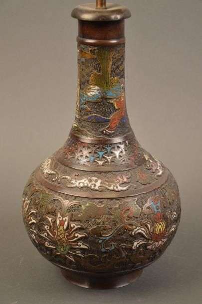 Vase à panse en bronze cloisonné à décor chinois Monté en lampe (non perçé) Signature apocryphe MING à 6 lettres sous la base Epoque fin XIXème siècle H: 35,5 - D. de la panse: 22 cm