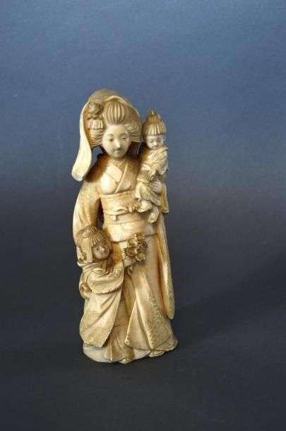 Okimono en ivoire sculpté représentant une mère et ses deux enfants Circa 1880 H: 20 cm (manque le fond)