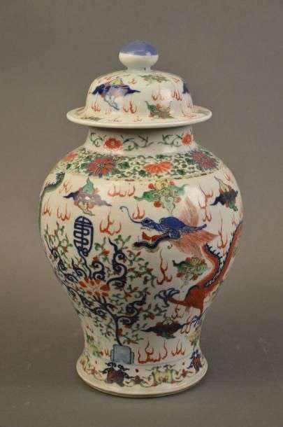 Potiche balustre couverte en porcelaine à décor d'émaux polychromes dit "WUCAI" de deux dragons à cinq griffes, dans le style Transition Epoque XIXème siècle H: 47 cm (Important fêle et éclat)