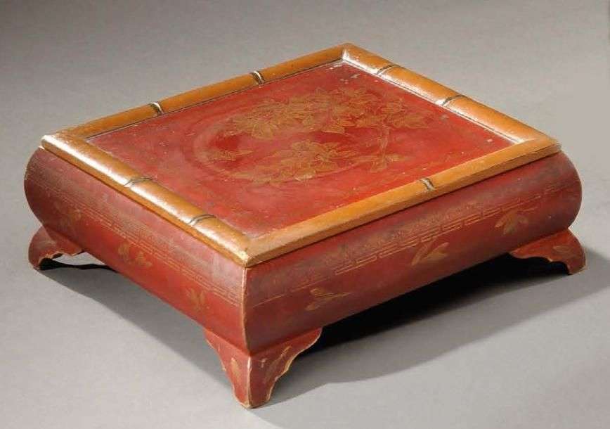Boîte carré en laque rouge à décor floral. Couvercle orné d'un encadrement imitant le bambou. Elle repose sur quatre pieds. Intérieur en laque noire. Vers 1830-1850 L: 24 - P: 24 - H: 9 cm (traces d'humidité)