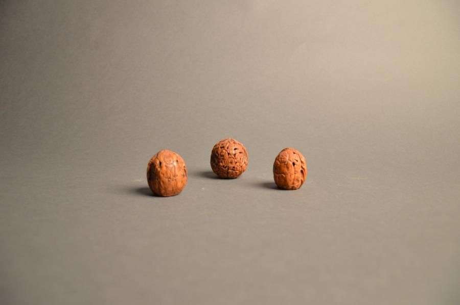 Trois noix sculptées à décor de scènes animées de personnages et de Buddha Deux sur socle XIXème siècle H:4.5 cm, 4 cm et 4 cm