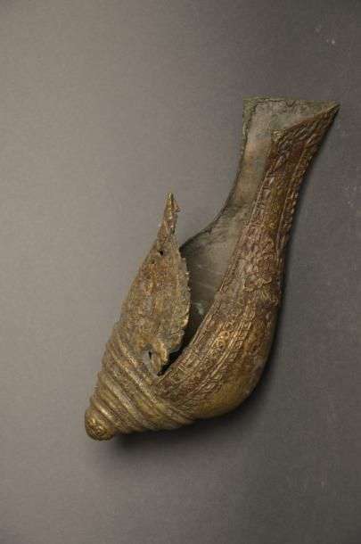 Pièce rituelle de mariage en laiton et bronze à décor en relief de motifs stylisés Travail probablement Khmer, XVIIIème siècle L: 23 cm