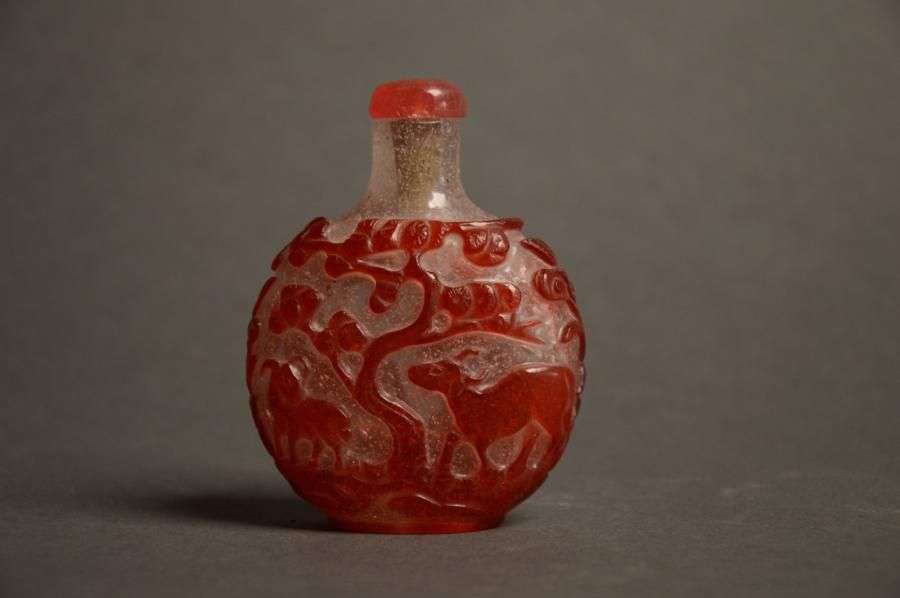 Tabatière en verre multicouche blanc et rouge à décor de chèvres et de bufles. XIXème siècle H: 8 cm (bouchon accidenté)