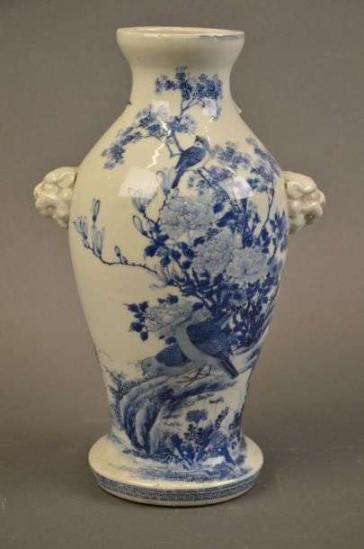 Vase balustre en porcelaine à décors bleu et blanc d'oiseaux branchés et de fleurs. Anses en forme de chien de Fô XIXème, fin Epoque Qing H: 35 cm
