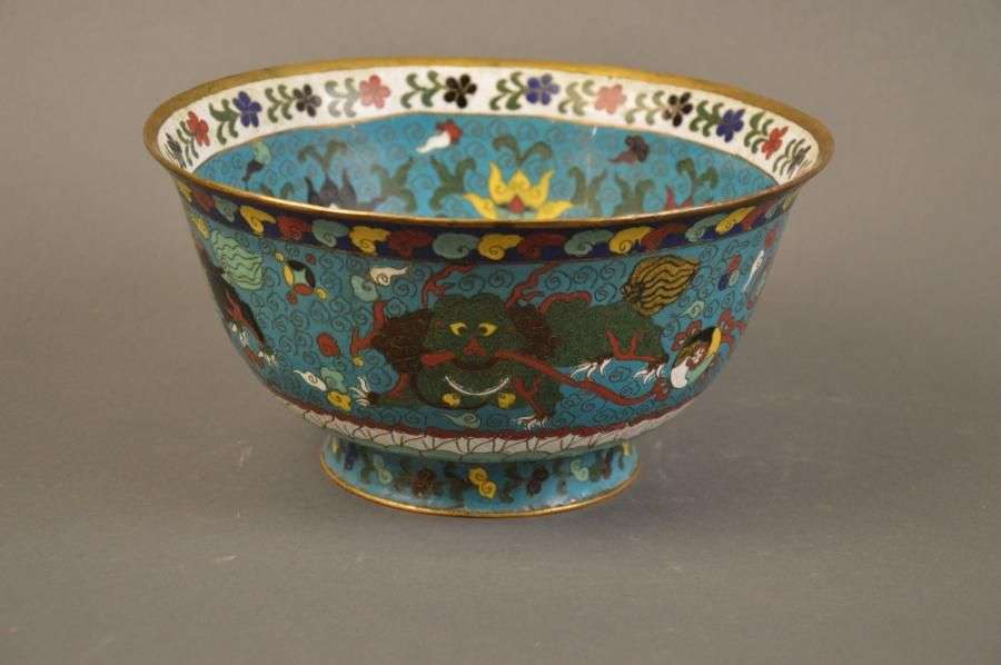 Coupe sur talon en bronze et émaux cloisonnés. La panse à décor de dragons poursuivant la perle sacré. Début XXème siècle H:13.5 - D: 26 cm 1236