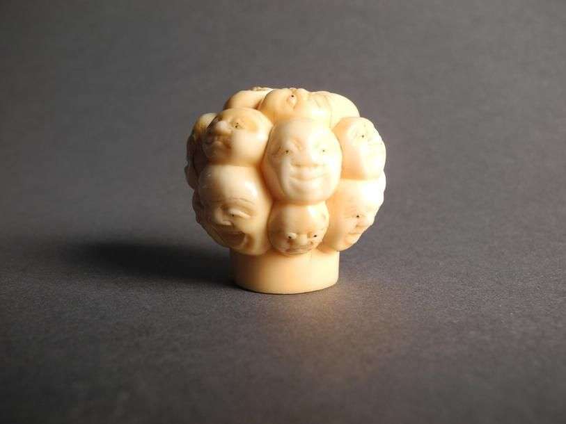 Pommeau de canne en ivoire sculpté de têtes de personnages riant Circa 1890 H: 4 cm