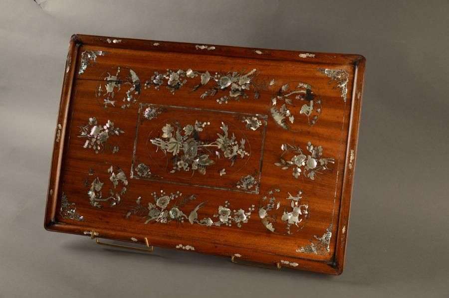 Plateau en bois de rose à incrustations de nacre de motifs floraux, papillons et de scènes de pêche et chasse dans des médaillons Fin XIXè siècle (Manques) 45 x 66 cm