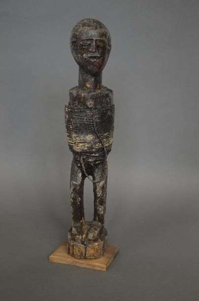 Fétiche vaudou anthropomorphe en bois. Le personnage debout a le corps entouré d'un lien dont l'extrémité rejoint une cheville de bois fichée au niveau du sternum. Importants restes de patine sacrificielle. h.: 45,5 cm