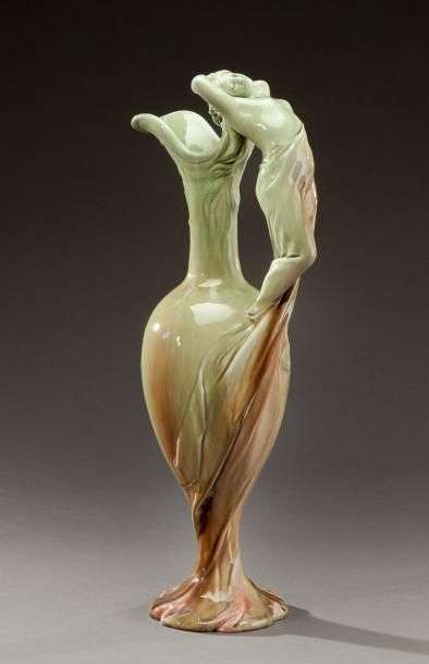 Importante aiguière à panse renflée en céramique émaillée verte nuancée mauve à décor en relief formant anse figurant une jeune femme drapée et d'un masque de faune. Trace de signature. H: 57 cm (éclat et fêle de cuisson)