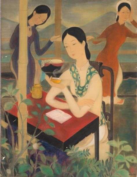 Gouache on silk, mounted on cardboard, signed with a stamp lower right Provenance Collection privéeFils du dernier roi du Tonkin, Le Pho rentre à l'Ecole des Beaux-arts d'Hanoï en 1925 et fait donc partie de la première promotion, inaugurant ainsi une rencontre importante entre le monde occidental et extrême-oriental. En 1931, il participe à l'Exposition coloniale qui se tient à Paris et passe les deux années suivantes à voyager en Belgique, au Pays-Bas, en Italie avant de retourner enseigner en Indochine. En 1937, il revient à Paris et s'y installe. Notre tableau est fidèle au style de l'artiste poétique et délicat. Nous retrouvons aussi son goût de la ligne et des couleurs en aplat dégageant une émouvante sérénité. The son of the last king of Tonkin, Le Pho joined the Fine Arts School in Hanoi in 1925 when he became a student of the first class of the newly formed Ecole des Beaux-Arts d'Indochine fine art school, thereby participating in an important encounter between the West and Far East. In 1931, he participated in the Paris Colonial Exhibition and spent the next two years traveling through Belgium, the Netherlands, and Italy before returning to Indochina to teach. In 1937, he returned to Paris to settle there. This painting is a moving rendition of the artist's delicate, poetic style. One can also here appreciate his appreciation of lines and areas of solid color in a painting that movingly expresses calm tranquility