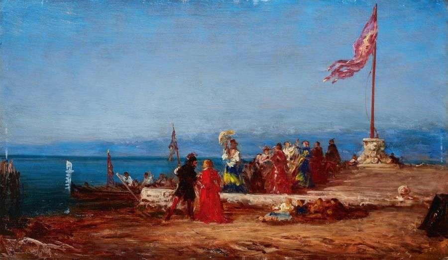 Promenade à Venise Huile sur panneau, marquée du cachet de l'atelier n°893 en bas à droite et au verso 44 x 75 cm - 17 1/4 x 29 1/2 in. Oil on panel, marked with a stamp from the studio n°893 lower right and on reverse. L'Association Félix Ziem, représentée par Messieurs Mathias Ary Jan, Davis Pluskwa et Gérard Fabre, a confirmé l'authenticité de cette oeuvre. Un certificat pourra être délivré sur demande Exposition Retrospective Félix Ziem, Palais des Arts, Marseille, 2011 Provenance Collection privée