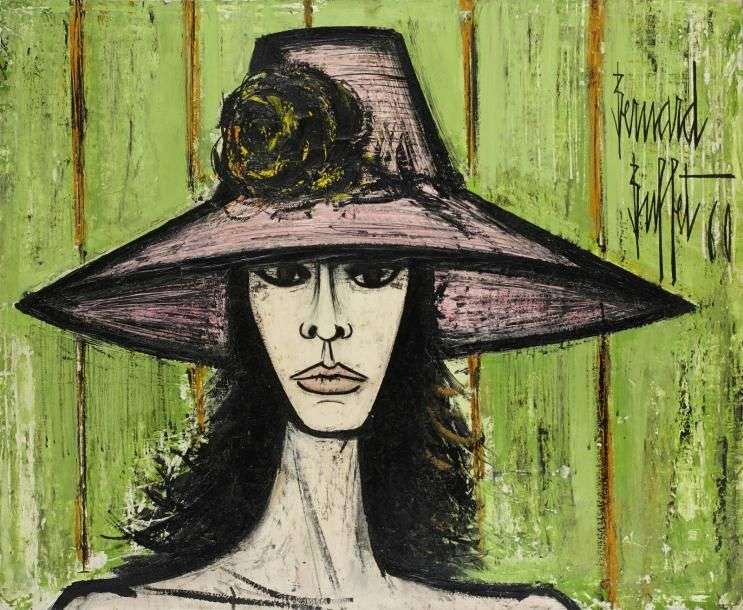 Rita, 1960 Huile sur toile, signée et datée en haut à droite 60 x 73 cm - 23 3/4 x 28 3/4 in. Oil on canvas, signed and dated upper right Bibliographie Cette oeuvre est enregistrée dans les archives Garnier de l'artiste sous le numéro 57D, numéro apposé au dos de la toile. Provenance E. David et M. Garnier, Paris, d'après une étiquette au verso Collection privéeNé en 1928, il entre en 1943 à l'Ecole Nationale des Beaux-arts. Lors de ses « débuts » de peintre, dans les années 1950-1958, il mène une vie mondaine auprès de Pierre Bergé. Apprécié aussi bien des collectionneurs, des critiques que de ses contemporains, sa popularité ne cesse d'augmenter. 1958 marque un tournant dans sa vie tant personnelle, il rencontre Annabelle qui deviendra sa femme, que professionnelle puisqu'il réalise sa première rétrospective. Le tableau que nous présentons à la vente illustre le traitement particulier, reconnaissable entre tous de l'artiste. D'abord par l'emploi du noir, dont le cerne rythme le portrait et y imprime une certaine mélancolie. On y retrouve également son goût du dessin et son sens de la couleur. Born in 1928, Bernard Buffet joined the Ecole Nationale des Beaux-Arts in 1943. In his "beginnings" as a painter, in the years 1950-1958, he led a sociable life in worldly circles with Pierre Bergé. As much appreciated by collectors, as by art critics and contemporaries, he continuously gained popularity. 1958 marked a turning point in both his private life as he then met Annabelle who was to become his wife, and his professional life since he held his first retrospective that year. The painting that is being presented at auction today illustrates this artist's particular and therefore highly recognizable treatment of colors. The use of black outlines rhythms the portrait and imbues it with a certain sense of melancholy. His passion for drawing and sense of color can also be keenly recognized