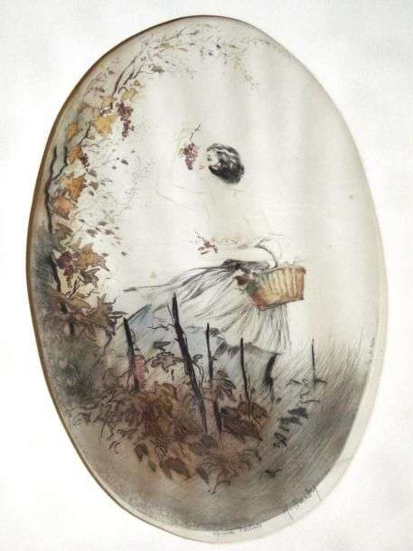Allégorie de l'automne Epreuve d'artiste Eau forte et aquateinte en couleur Signée en bas à droite 43 x 29 cm