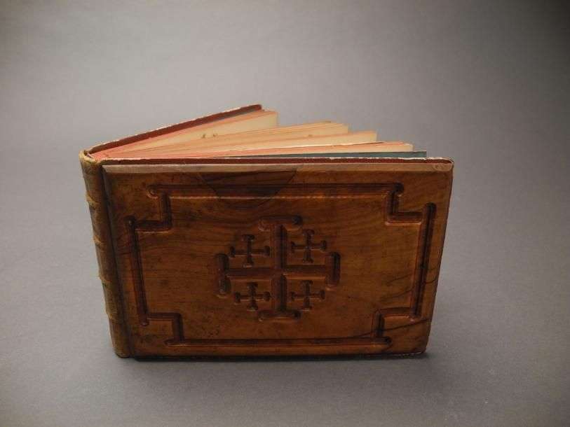 «Flowers from the Holy land » Herbier en un volume format à l'italienne Plats en olivier sculpté d'une croix de Jérusalem Dos de cuir fauve. Boulos MEO. Jerusalem 1888