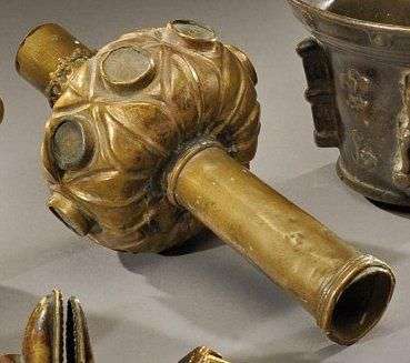 Noeud de croix de procession en cuivre doré La partie supérieure à motif gothique, la panse ornée de cabochons ronds décorés de croix de Malte et de rosaces gravées, la base cylindrique légérement évasée. XVe siècle (soudures au plomb, usures à la dorure) H: 24 cm