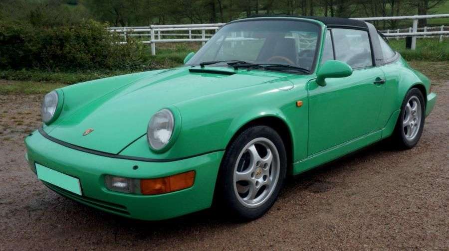 PORSCHE 964 TARGA TIPTRONIC Le succès de la 911 s'est fait grâce à de multiples évolutions. Sans jamais perdre ses afficionados, la belle a toujours su rester une référence parmi les sportives. Fin de la décennie 80, Porsche travaille sur le remplacement de la 3.2L. C'est la 964 qui est présentée en septembre 1988 au salon de l'auto de Paris et pour la première fois dans l'histoire de Porsche en quatre roues motrices. La version deux roues motrices sortira l'année d'après avec les versions Targa et cabriolet. Les trois déclinaisons de carrosserie peuvent bénéficier de la transmission 2 ou 4 roues motrices. Bien qu'esthétiquement très proche de la 3.2 litres même si elle propose des pare-chocs enveloppants et des jupes en bas de caisse, la nouvelle 911 est nouvelle à 85 %. Cette génération très courte de 911 qui ne durera que 4 ans sera produite à un peu plus de 31 000 exemplaires. La 964 conserve le célèbre Flat 6 refroidi par air, cette fois-ci catalysé et à double allumage. Doté de 3,6 litres de cylindrée il développe 250 ch à 6 100 tr/mn. La voiture s'offre des performances de premier rang avec un 0 à 100 km/h abattu en 5»5 et le kilomètre DA en 25». Le moteur peut être associé à une boîte manuelle 5 rapports ou Tiptronic 4 rapports basée sur une boîte d'origine ZF 4 vitesses avec convertisseur de couple. La direction assistée est montée en série, ce qui rend la voiture plus facile à conduire que la 3.2L. Nouveauté importante, un aileron se déploie automatiquement à partir de 80 km/h. En 1992 un restylage engendre le remplacement des jantes Speedline par des jantes et des rétroviseurs plus aérodynamiques appelés «Cup». Les Airbags à l'avant deviennent de série tout comme la climatisation. Le freinage opéré par 4 disques est à la hauteur de la réputation de la marque. Enfin l'habitacle est une légère évolution de la 3.2 mais conserve en tous points l'esprit 911 et ce fameux compte-tour en position centrale. Le modèle présenté est une Carrera 2 version Targa de 199