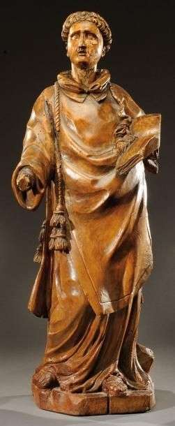 Importante statue en bois sculpté probablement porte reliques, représentant Saint Etienne en habit de Diacre, tenant un livre ouvert sur son bras gauche et portant autour du cou une corde de pénitent. Traces de polychromie. (manque le bras gauche et la main droite)
