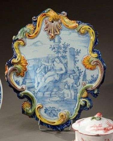 Plaque de forme chantournée en faience polychrome à décor d'une allégorie de l'architecture XVIIIème siècle (accidents)