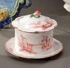 Confiturier couvert avec plateau en faience à décor en camaieu rose de paysages Marque au deux C entrelacés du Comte de custine XVIIIème siècle (égrenures)