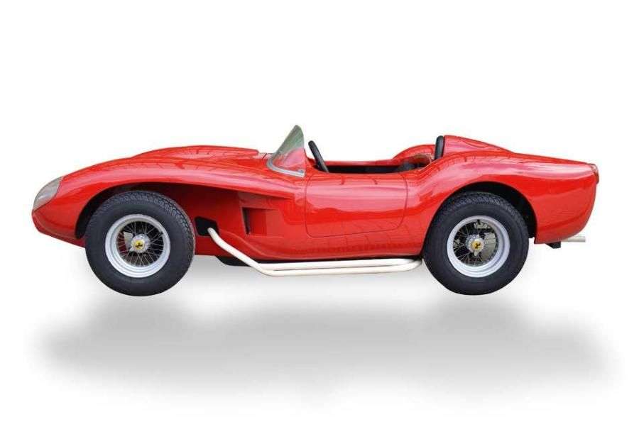 Jouet automobile des années 90 fabriqué par Claude BOUTIN rappelant la Testa Rossa des années 50. Sa coque rouge en polyester est autoporteuse, elle est équipée d'un moteur Honda GX140 de 5 cv à l'avant, d'une transmission par cardans, d'une suspension indépendante sur les quatres roues à rayons, de freins hydrauliques, d'un démarreur électrique. L'instrumentation est complète. Le pare brise et les protections de phare sont thermoformés. Equipement intérieur: deux sièges baquet volant trois branches, moquette noire, tapis noir avec liseré rouge, soufflets de frein à main et de levier de vitesse rouges. Pare-brise fêlé. Dimensions: L.: 280 cm - l.: 120 cm (env.) Vitesse: 70 Km/h Cylindrée: 144 cm3 Kilomètrage: 9 Eligible au Little Big Mans