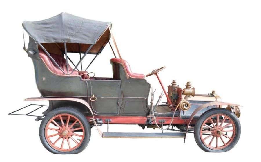 La société Adolphe Clément fonda son succès dans l'industrie du cycle et la distribution de pneus. Adolphe Clément construit dès 1899 des voiturettes, puis des voitures de tourisme et de luxe. Il conclura de nombreuses licences avec des partenaires anglais. L'une de ses usines étant implantée à Mézières, ville où le chevalier Bayard s'est illustré, il l'adoptera comme emblème en 1904. La construction des automobiles durera jusqu'en 1922. La voiture que nous présentons est un modèle type AC2 de 1904, double phaéton de type tulipe à entrée latérale. Elle est dans un état de conservation très intéressant et porte toujours son immatriculation d'origine. Au cours de son histoire, les 2 pistons ont été changés et les cylindres réalésés par la SARL Ruphil en 1994. L'axe de la pompe à eau fut aussi refait par Monsieur Vert qui fut anciennement tourneur à l'usine Clément-Bayard. Sa patine est très belle, elle est complète. Elle fut remisée il y une dizaine d'année dans de bonnes conditions de stockage. Elle est équipée d'un moteur bicylindre accouplé à une boite à 3 rapports et marche arrière, la voiture nécessitera une remise en route complète. Elle possède des sièges de cuir rouge, séparés à l'avant et sous forme de banquette à l'arrière, tous capitonnés. Elle est munie de sa capote et de housses de sièges en tissu. Les parties boisées présentent une agréable patine et rien ne semble avoir altérer l'élégance de cette voiture. La voiture allie le rouge, le noir et le cuivre. L'histoire de cette voiture est exceptionnelle. Elle fut achetée par Monsieur Albert Clément-Bayard, petit-fils du constructeur Adolphe Clément-Bayard le 16 septembre 1956. Elle appartenait alors à Monsieur à M. Louis Jacquet, antiquaire à Cluny en Saône-et-Loire. A l'époque, elle fut achetée pour 350 000 anciens francs et découverte quelque peu par hasard par Monsieur Clément Bayard. La voiture était remisée et non utilisée. Elle avait précédemment été la propriété de Monsieur Robert Du Corail, Comte d