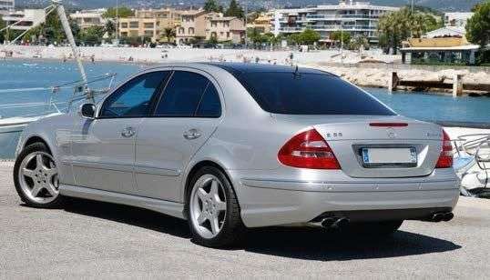 La Classe E de type W211 est la troisième génération de Classe E chez le constructeur à l'Etoile. Sa carrière débutera en 2002 pour s'achever en 2009. Mercedes qui par le passé avait déjà proposé une berline dotée de réelles qualités sportives va de nouveau s'essayer à l'exercice de style. C'est ainsi que la Classe E 55 AMG Kompressor sera lancée en 2003 avec pour objectif de devenir la référence en matière de berline sportive haut de gamme. Elle sera d'ailleurs la plus puissante de toutes les générations de Classe E. Comme toujours chez Mercedes c'est à son département sportif AMG qu'est confié le développement de la voiture et comme une oeuvre d'art, chaque moteur assemblé arbore une plaque sur laquelle est gravée la signature du mécanicien. Esthétiquement la voiture reprend les codes de la berline classique avec cependant quelques détails soulignant les capacités sportives de l'engin. Elle est chaussée de jantes plus larges accueillies sous des ailes élargies elles aussi. Les quatre sorties d'échappement trahissent enfin le caractère sportif de la voiture. Le moteur V8 de 5,5 litres de cylindrée est accouplé à un compresseur lui permettant de développer 476 ch et le couple disponible à très bas régime est «camionesque». La transmission est automatique à 5 rapports. Les performances sont au rendez-vous avec un 0 à 100 km/h abattu en 4,7 secondes et une vitesse de pointe qui dépasserait allégrement les 250 Km/h si elle n'était pas limitée électroniquement. Le comportement est un parfait compromis entre confort et efficacité grâce à la suspension pneumatique Airmatic DC, sa direction et ses freins retravaillés. L'habitacle soigne le confort de ses passagers avec les fameux sièges «multicontour» tout en cuir, le toit panoramique, des inserts de boiseries et un système de navigation «Comand Aps». La E 55 AMG sera produite jusqu'en 2006 avant qu'elle ne laisse sa place à la version E 63 AMG dont le moteur sera entièrement développé par AMG. La voiture présentée est par