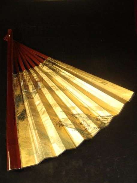 Grand éventail à vingt-deux branches à fond or décoré de scènes animées Chine XXème Long.: 150 cm