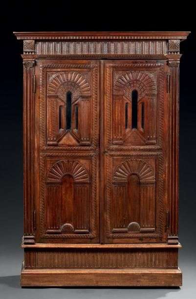 Armoire en noyer richement sculpté de canaux à palmettes, denticules, raies de coeur| elle ouvre par deux portes à décor architecturé en perspective d'arcatures et pilastres. XVIIIe siècle (restauration dans les fonçures). H: 205cm - L: 142cm - P: 57cm.
