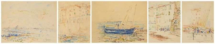 Collioure, 1924 Cinq aquarelles et crayon, signées, situées et datées en bas à droite ou à gauche environ 31 x 24 cm à vue chaque