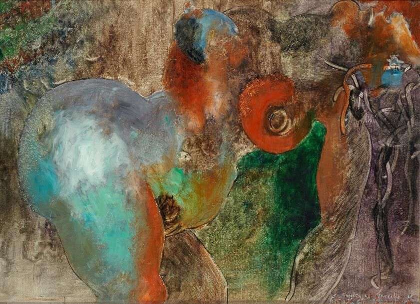 Composition Acrylique sur toile, dédicacée en bas à droite "à Nicolas et Marcelle, festival du faux" 46 x 61 cm