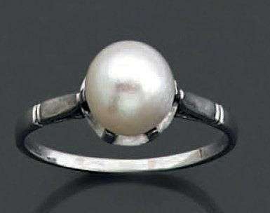 Bague en platine sertie d'une perle supposée fine - non testée. Diam: 6.5 à 7.7 mm env Tour de doigt: 56 Poids brut: 3.2gr