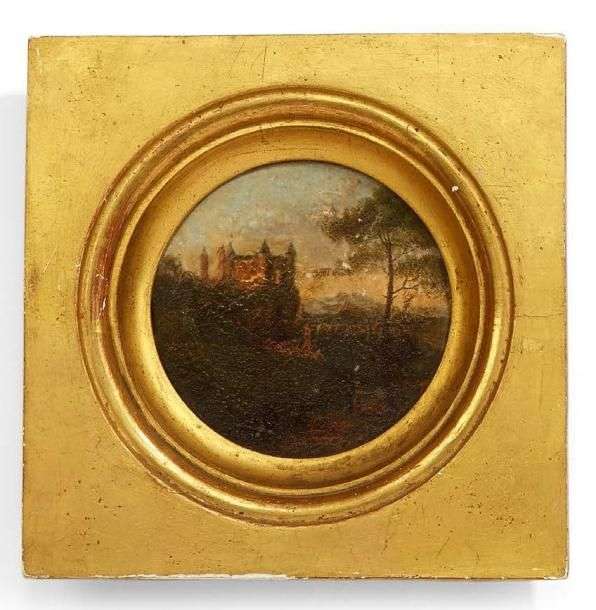 Vue d'un château dans un paysage. Huile sur panneau de bois. Diam.: 8.3 cm