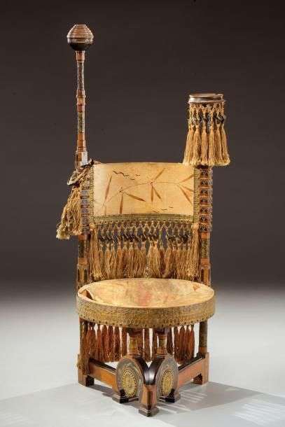 Chaise à structure asymétrique en noyer teinté à dossier cintré et assise circulaire garni de vélin tendu à motif japonisant peint. Il présente un décor d'incrustations de cuivre et de zinc et est agrémenté de pompons de soie. Signée de la plaquette «Fabb.Ital.Mobili Artici/A.De Vecchi & Cia/C Bugatti/Milano». Vers 1902. H: 122 cm l: 45 cm P: 46 cm (accidents et manques) An asymmetric shaped tinted walnut chair covered in stretched vellum painted with a Japanese style motif. Signed on a small plate «Fabb.Ital.Mobili Artici/A.De Vecchi & Cia/C Bugatti/Milano». Circa 1902. H: 48 in W: 17 ¾ in D: 18 in Bibliographie: Philippe Dejean, «Bugatti», Editions du Regard, Paris, 1981, modèle reproduit page 86.