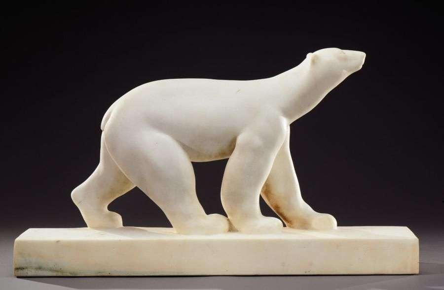 Rare et importante sculpture en taille directe sur marbre de Carrare figurant un ours blanc. Signée «A.Gennarelli». Vers 1930. H: 41 cm L: 72,5 cm P: 16,5 cm A rare, directly carved Carrare marble sculpture of a polar bear. Signed «A.Gennarelli». Circa 1930. H: 16 ¼ in L: 28 ½ in D: 6 ½ in