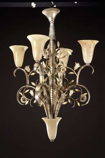 Rare lustre à armature en fer forgé martelé et argenté présentant un fût composé de tiges quadrangulaires d'où s'élancent quatre bras de lumière formant enroulement à décor ajouré de motifs feuillagés. Ils sont surmontés de cache-ampoules en forme de tulipes en albâtre. Estampillé du cachet frappé en creux «E.Brandt». Vers 1925. H: 100 cm Diam: 68 cm A rare silver-plated and hammered wrought iron centre light with four leafy branches of lights and alabaster tulip shades. Intaglio engraved stamp «E.Brandt». Circa 1925. H: 39 ¼ in Diam: 26 ¾ in