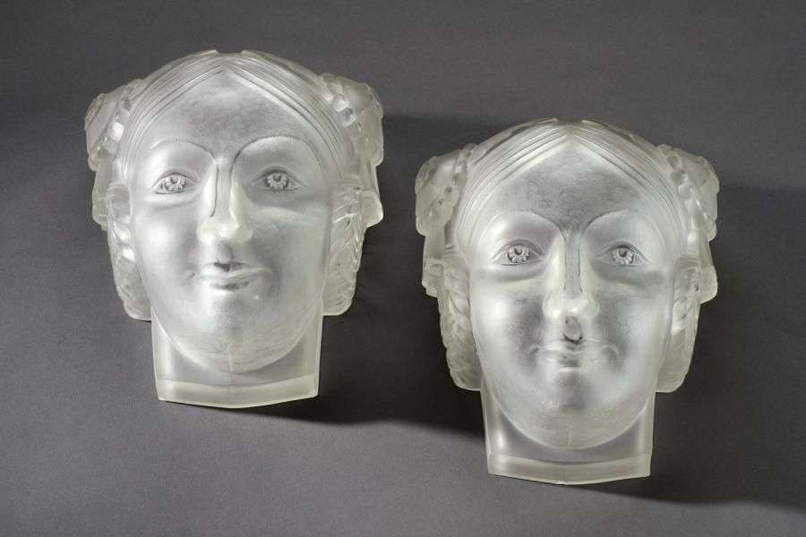 Paire d'appliques en verre translucide moulé-pressé à surface satinée martelée figurant deux visages de femme. Signées "Sabino 4684 Paris déposé". Vers 1930. H: 26 cm l: 22 cm P: 13 cm (légers éclats) A pair of translucent, moulded-pressed glass wall lamps representing the faces of two women. Signed "Sabino 4684 Paris déposé". Circa 1930. H: 10 ¼ in W: 8 ¾ in D: 5 in